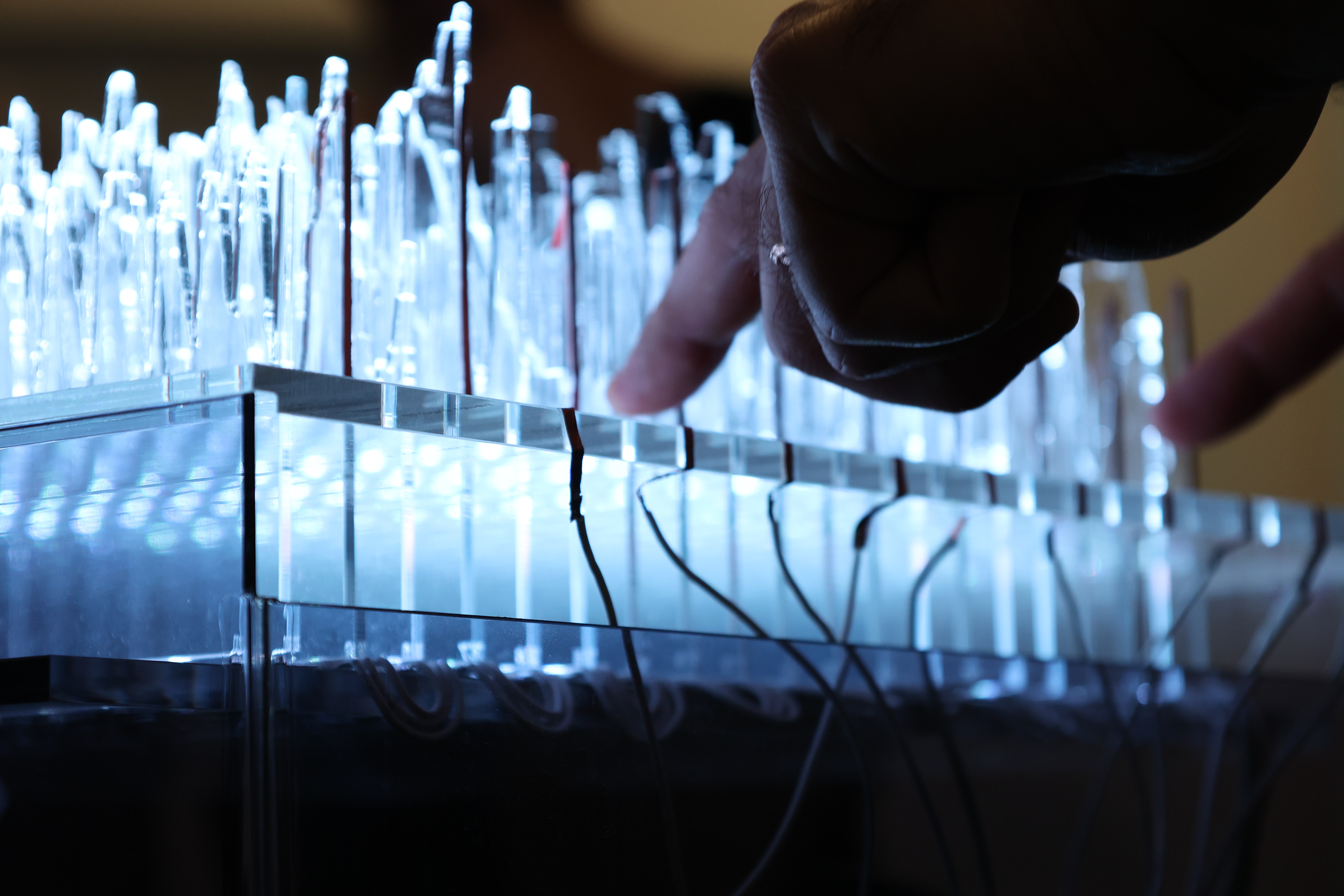 Waving Graphs is an interactive installation which can be experienced through different senses: auditory, tactile and visual. Data graphs of the signature wave of male fiddler crabs to attract female fiddler crabs were used in this installation. This is a waving movement with their big claw. On the one side you can feel the cut out data graphs by touching. On the other side the data graphs were translated into sound on this way they become audible. The visibilty is supported by leds. In addition the entire structure represents the work of the scientists through its material and presentation. Aswell as the animals next to the sensors, cameras and cables used to get a glimpse of their behavior.